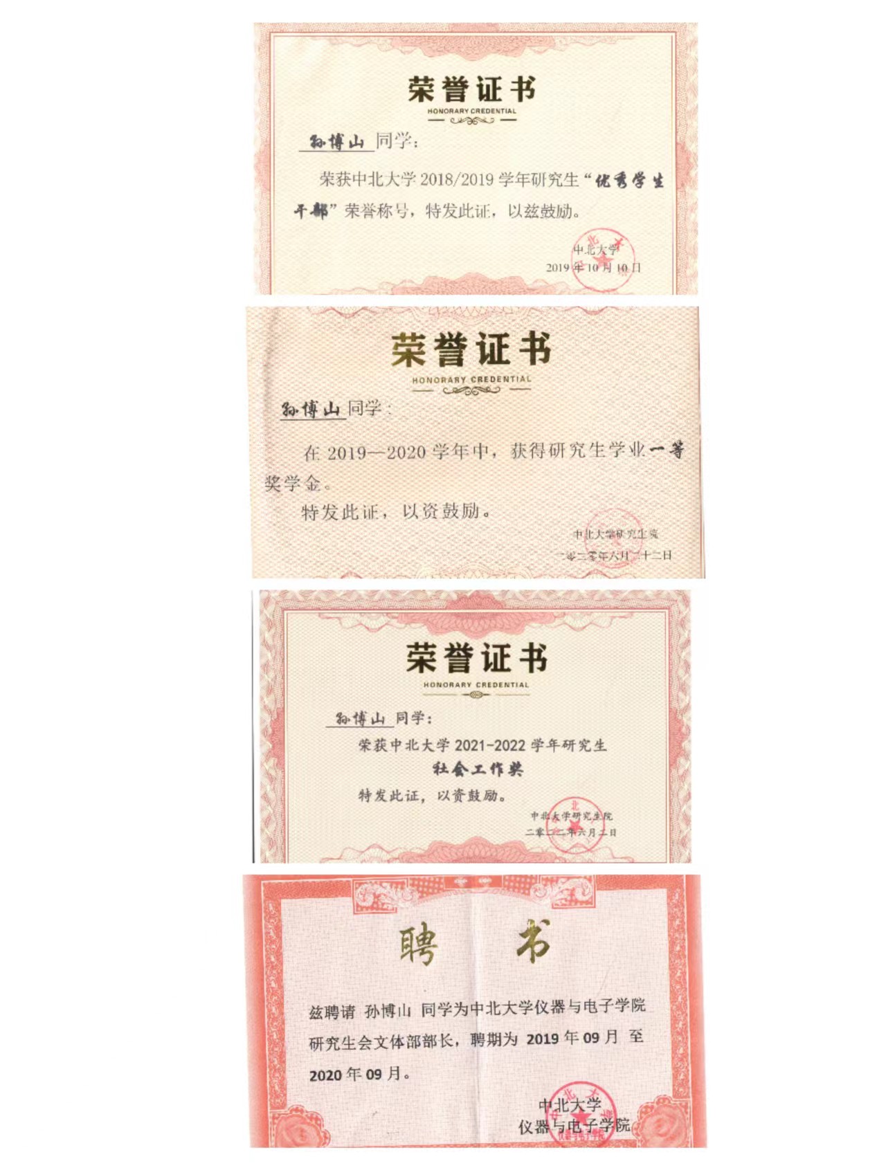 获得三好学生标兵荣誉称号1次,优秀学生干部荣誉称号2次;