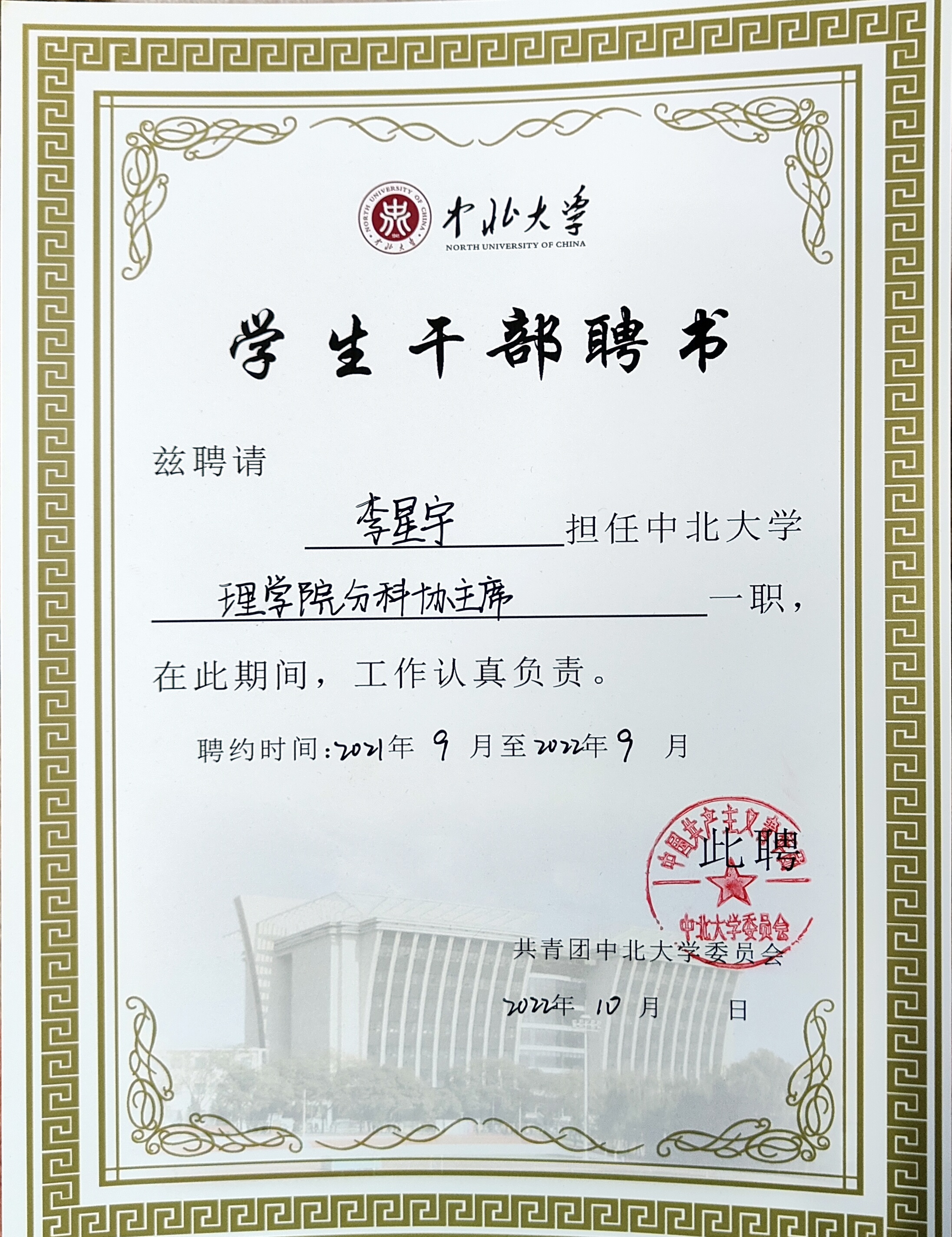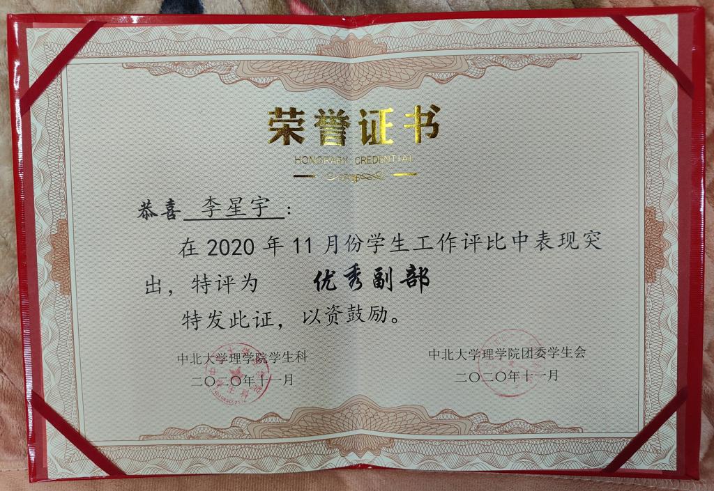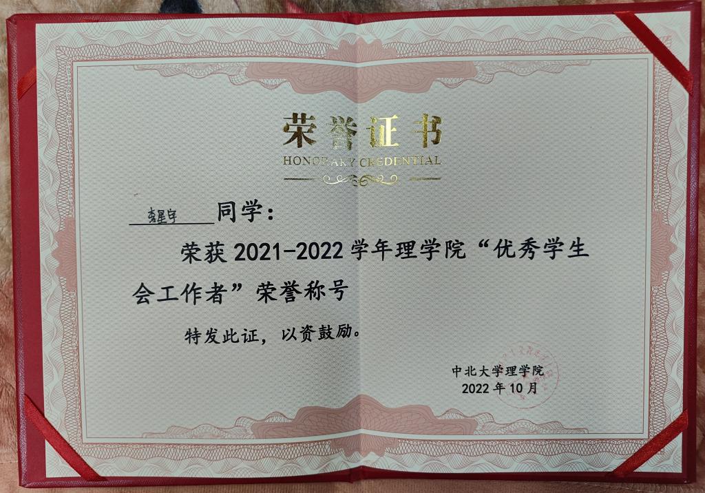 荣获2021-2022学年理学院 “优秀学生会工作者”