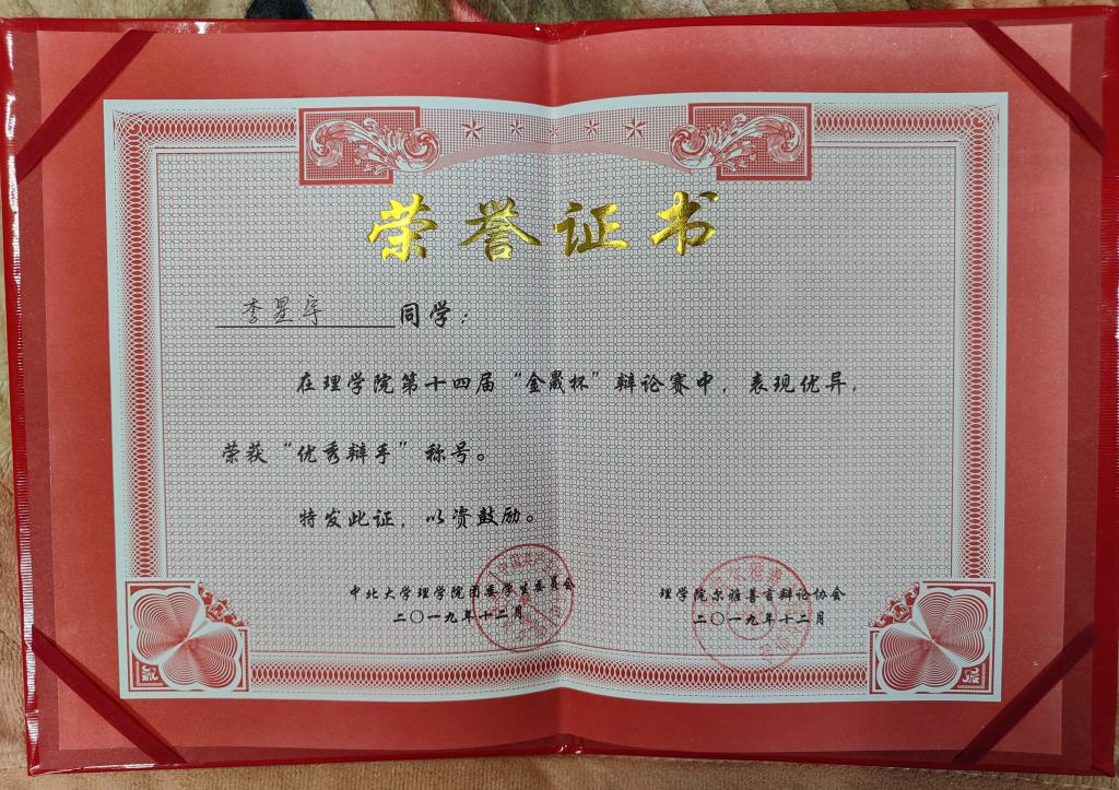 荣获2019年理学院第四届“金晟杯”辩论赛优秀辩手