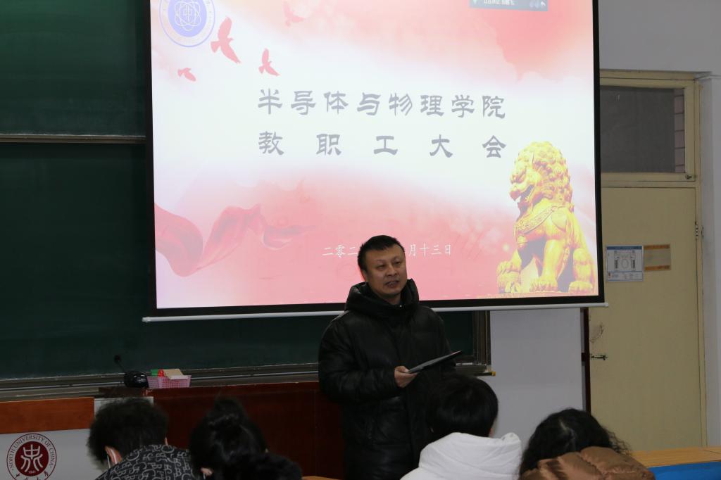 的成立进行了介绍,接着详细阐述了学院教学工作的现状和规划。由于疫情原因,近期的教学和考试都安排线上进行,希望各位老师能在完成教学任务的同时保证教学质量。在专业建设方面,既要把已有专业建设好,也要根据市场需求的变化,考虑拓宽专业方向和调整目标设置。在学生培养方面,要明确培养方向,设置相匹配的课程内容。最后欢迎大家踊跃积极的提供想法和建议。