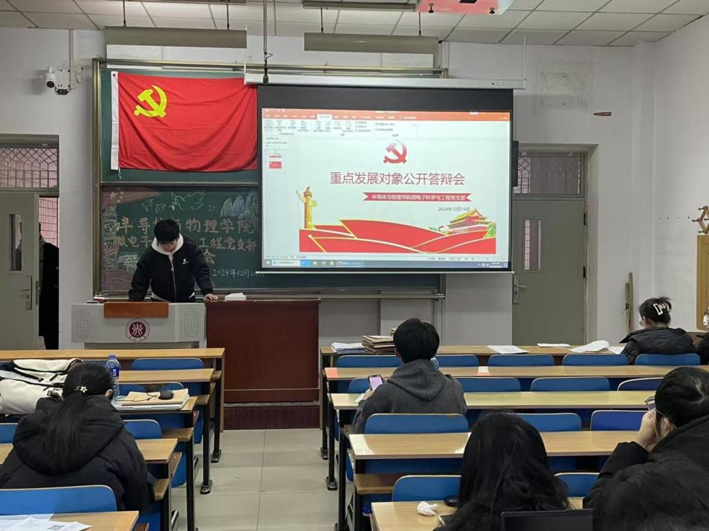 微电子科学与工程党支部于11307H召开重点发展对象公开答辩会。大会由党支部侯凯祥同志主持。支部书记荆伟伟老师、全体正式党员、预备党员出席会议。