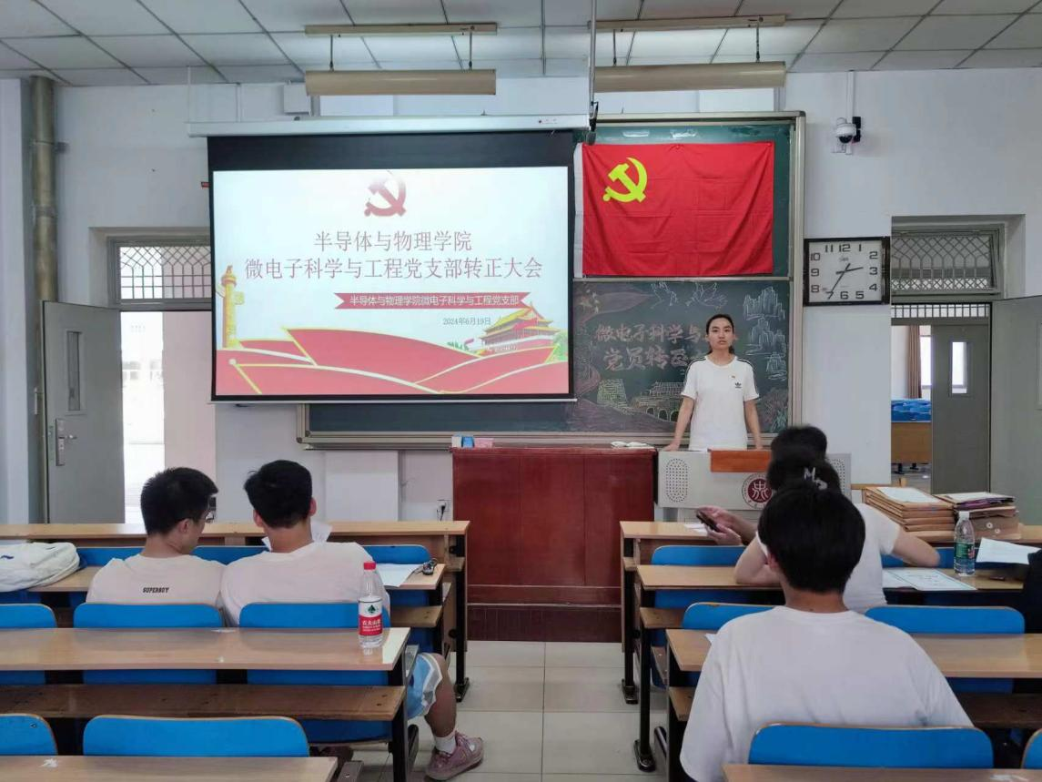 微电子科学与工程党支部于11106H召开预备党员转正支部大会。大会由党支部张沛甲同志主持。支部书记荆伟伟老师、王旭老师、支部全体正式党员、预备党员出席会议。